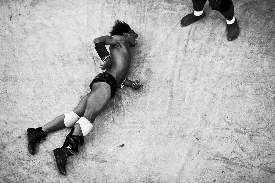 Wrestler "Super Chato" winds up to land a punch on Frank Stein during a wrestling match at the Midland County Fair in Midland, Michigan on Aug. 17, 2009.