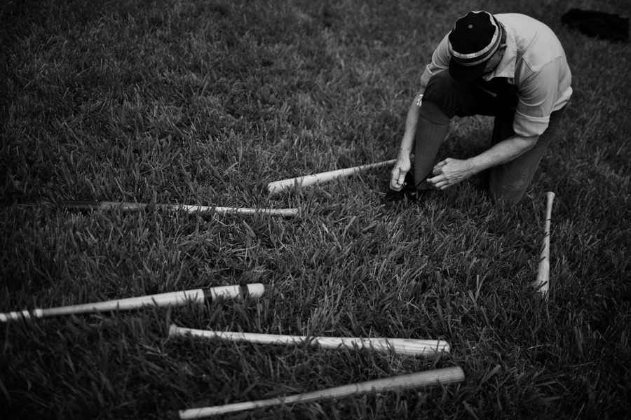 67 year-old Elkton Eclipse player Bill "Pockets" Freeland, from Cecil County, Md., ties his shoe between innings during their game against the Potomac Nine team during the Loudoun Preservation Society's 19th Century Baseball Day at the Oatlands, in Leesburg, Va., Sunday, June 12, 2011. This is Freeland's third year playing in the league and he said he enjoys it more than softball leagues. "I'll keep playing this until I forget which way to run, then I may take up golf," he joked. Freeland was the oldest player on the field that day. (Drew Angerer/The Washington Times)